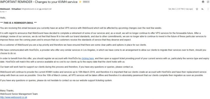 Apparently, I didn’t realize an email two weeks ago that my previous VPS hosting, WebSound decided to kick all its customer as they are shutting down the VPS business. I finally noticed that they sent me an e-mail 2 days ago about this issue. They said that they are going to shut down all VPS on March 10! They only give 2 weeks notice period of their cancellation and they...